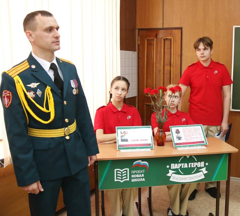 Для торжественного открытия Парты Героя пригласили двух юнармейцев – две девочки, которым предоставили право первыми сесть за эту парту. Вообще, как отмечалось, право сидеть за ней будет присуждаться учащимся за отличные оценки, а также за высокие достижения и активное участие в жизни школы и города.